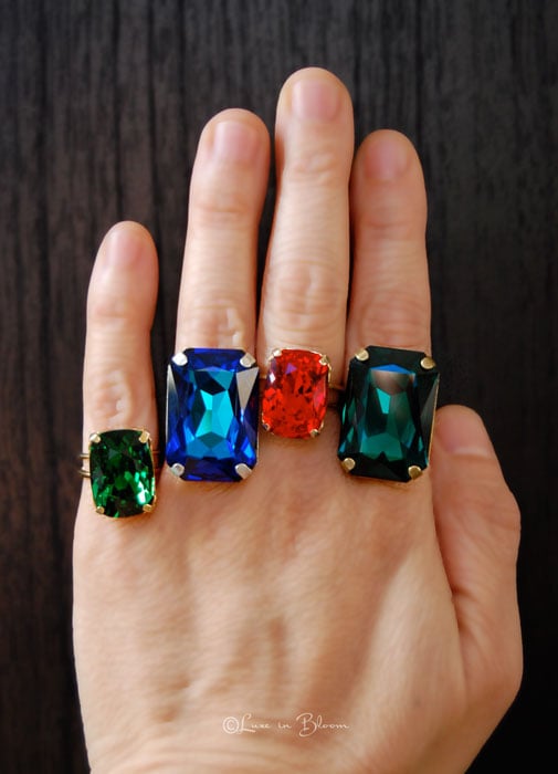 This stunning large Swarovski emerald ring is a lovely Bridesmaid gift. Wonderful anytime you want to add a splash of color for instant fashion flair.